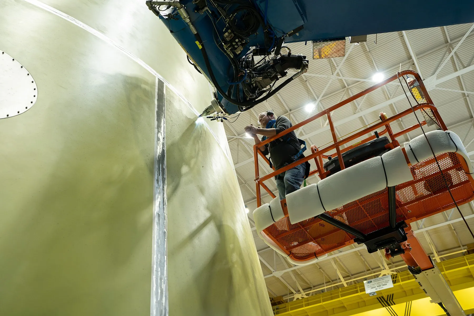 با استفاده از ابزار پیشرفتهی رباتیک و یک فرآیند ابتکاری به نام «جوشکاری همزن اصطکاکی» (Friction Stir Welding) تکنیسینها جوشکاری مخروطهای بالایی و پایینی را برای اتصال به سازه کامل کردند.