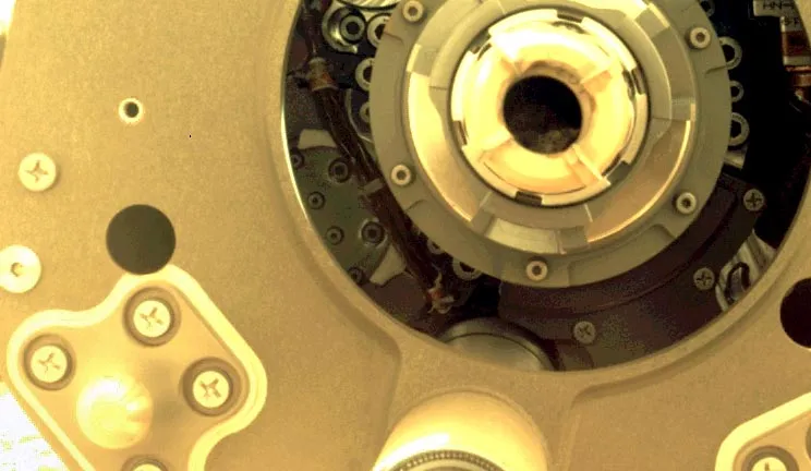 عکس کاور: نمای نزدیک توسط ابزار واتسون از سنگریزههای باقیمانده در ظرف نمونهگیری