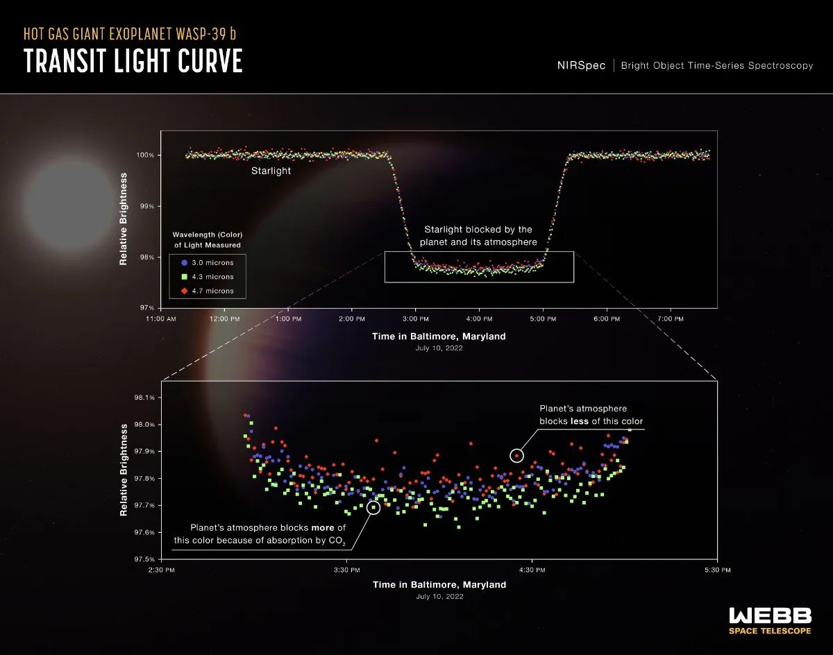 پژوهش اخیر با استفاده از طیفنگار فروسرخ نزدیک (NIRSpec) جیمز وب انجام شد و در طیف حاصل از جو WASP-39 b، یک قلهی کوچک بین طول موج 4.1 تا 4.6 میکرومتر، نخستین شواهد دقیق و واضح را از وجود کربن دیاکسید در یک سیارهی فراخورشیدی را ارائه داد.