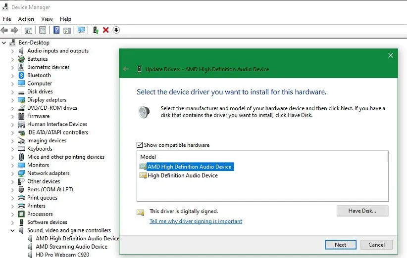 مطمئن شوید که گزینهی Show compatible hardware را علامت زدهاید. سپس در قسمت Model، گزینهی High Definition Audio Device را انتخاب کرده و گزینهی Next و Yes را بزنید. ممکن است برای اعمال تغییرات لازم باشد تا سیستم خود را ریاستارت کنید.