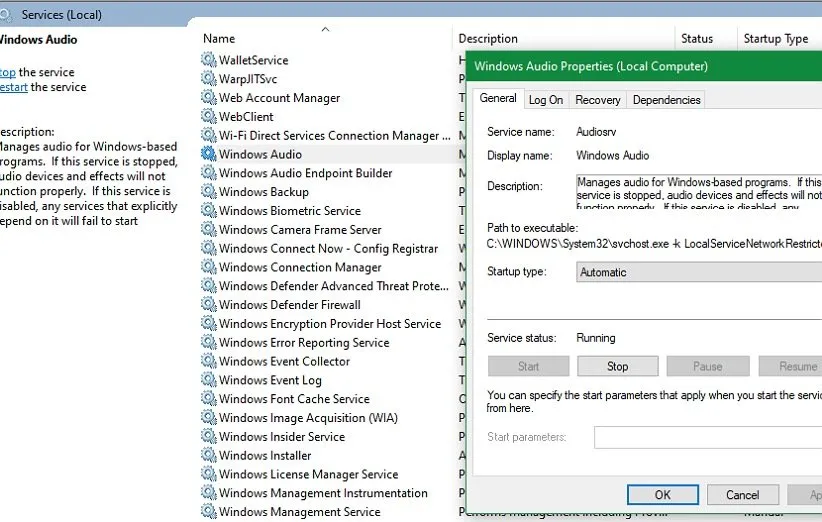 اگر مشکل قطعی صدای سیستم شما با انجام دادن تمامی روشهای معرفی شده حل نشد، این احتمال وجود دارد که سرویسهای صوتی ویندوز شما دچار اختلال شده باشند. برای بررسی و حل این مشکل، عبارت Services را در منوی Start تایپ کرده تا بخش Services Manager برای شما باز شود. سپس به سمت پایین اسکرول کرده تا بخش Windows Audio را پیدا کنید. اگر این سرویس اجرا نشود، سیستم صوتی ویندوز شما به درستی کار نخواهد کرد. با دوبار کلیک کردن و انتخاب Start دوباره آن را فعال کنید.