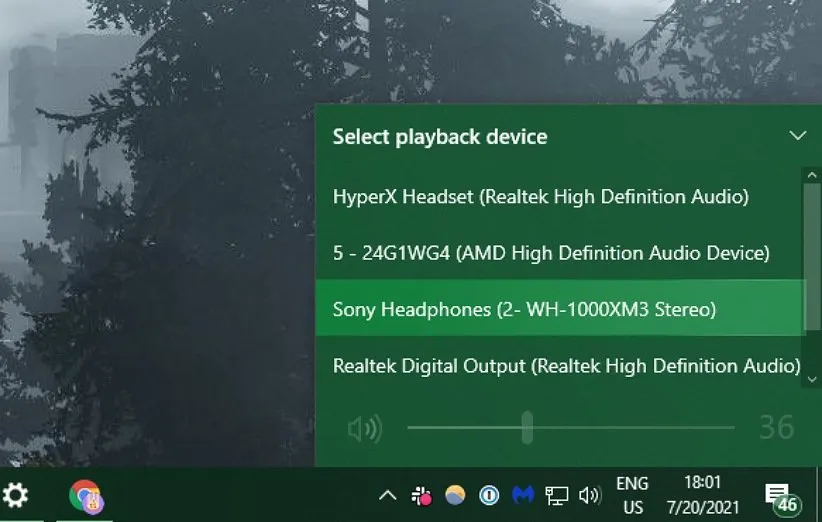 برای تغییر دیوایس مورد استفاده جهت پخش صدا، دوباره روی آیکون میزان صدا کلیک کنید. در بالای نوار لغزندهی صدا، اگر بیش از یک دیوایس فعال داشته باشید، نام دیوایس فعلی را خواهید دید. روی آن کلیک کرده تا منوی تمام دیوایسهای متصل به سیستم شما باز شود، سپس خروجی صدا مورد نظر خود را از لیست انتخاب کنید.