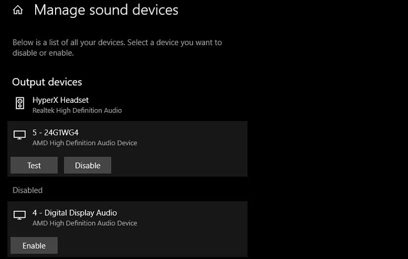 گزینهی Disabled را بررسی کنید تا مطمئن شوید دیوایسی را که میخواهید استفاده کنید، غیرفعال نشده باشد. روی گزینهی Enabled بزنید تا در صورت نیاز دوباره دیوایس صوتی مد نظر شما فعال شود.