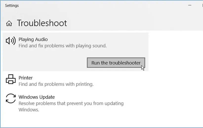 از مسیر Settings > Update & Security > Troubleshoot > Additional troubleshooters استفاده کرده و گزینهی Playing Audio را بزنید. سپس مراحل گفته شده را دنبال کنید تا سیستم به طور خودکار اشکالات صدای سیستم شما را مرتفع سازد. پس از اتمام عیبیابی شما میتوانید جزئیات مشکلات صدا سیستم خود را شناسایی کنید.