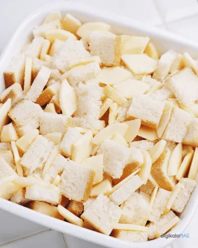 کف یک قالب فر به ابعاد 25*25 سانتیمتر را با کره چرب کنید و نانها و سیبها را به صورت مخلوط در آن بریزید.
