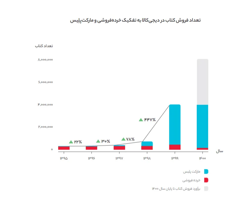 فروش کتاب در بخش مارکتپلیس دیجیکالا بسیار بیشتر از سهم خردهفروشیها است؛ بهطوریکه در سال گذشته ۳ میلیون و ۹۰۰ هزار کتاب ازطریق مارکتپلیس دیجیکالا به فروش رفته که ۹۰ درصد فروش کلی کتاب در این پلتفرم را شامل میشود.