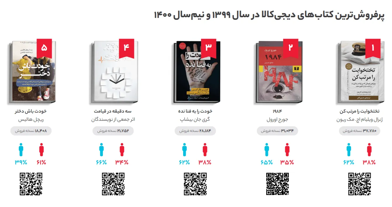 تصویر زیر، پرفروشترین کتابهای دیجیکالا از سال ۹۹ تا شهریور ۱۴۰۰ را بههمراه میزان نسخه فروشرفته و جنسیت خریدار این کتابها نشان میدهد: