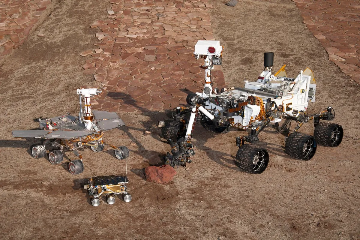 مقایسهی سه نسل از مریخنوردهای ناسا در آزمایشگاه پیشرانش جت؛ نمونهی دوقلوی سوجورنر در جلو دیده میشود، دوقلوی مریخنوردهای روح و فرصت که در سال 2004 به مریخ رسیدند در سمت چپ قرار دارد و نمونهی مریخنورد کنجکاوی هم که در سال 2012 بر سطح مریخ فرود آمد در راست قرار گرفته است.