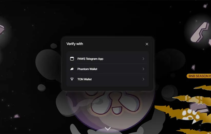۴. در پنجرهی جدیدی که ظاهر میشود، یکی از گزینههای PAWS telegram App یا Ton Wallet را انتخاب کنید تا پروسهی اعتبارسنجی پاوز انجام شود. اگر در محیط کامپیوتر مشغول برداشت توکن پاوز هستید، گزینهی اول یعنی اپلیکیش تلگرام کارایی بیشتری دارد و اگر با موبایل مشغول به کار هستید، ضربه زدن روی TON Wallet کاربردیتر و آسانتر است؛ چون سیستم وبسایت پاوز به طور سریع به ولت تون کیپر شما متصل میشود. برای اتصال به روش تون ولت، باید نرمافزار تون کیپر را روی گوشی موبایل باز کرده و سپس گزینهی Scan را در صفحهی اصلی تون کیپر لمس کنید. در نهایت با دوربین گوشی موبایل خود، کد QR موجود در صفحهی وبسایت پاوز را اسکن کنید. اگر ولت فعلی شما همان آدرسی باشد که شما در گذشته به پاوز متصل کرده بودید، پروسهی اعتبار سنجی با موفقیت انجام میشود.