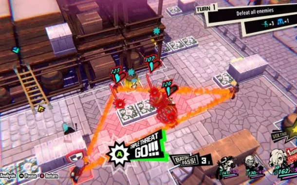 تاکید Persona 5 Tactica بر گیمپلی تاکتیکی خود میتواند پیامدهای جالبی بر پویایی نبرد داشته باشد. همچنین با روشهای همکاری برای مقابله با آسیبها وارد شده از سوی دشمنان، بازی دارای یک دستور هوشمندانه به نام Triple Threat است که به نظر میرسد شبیه به حملهی مثلثی Fire Emblem عمل میکند و از طریق یک تیم ویرانگر به دشمنان اطراف حمله میکند.
