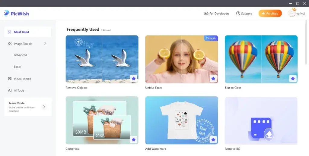 PicWish فراتر از حذف پسزمینه عمل میکند و مجموعهای از ابزار ویرایش تصویر را ارائه میدهد. با ابزار Enhancer، تصاویر تار یا کمکیفیت را وضوح میبخشد، عکسهای قدیمی سیاه‑سفید را رنگآمیزی میکند و قابلیت بزرگنمایی تا چهار برابر همراه با اصلاح رنگ و کنتراست دارد بهعلاوه با گزینه Remove Object، کاربران قادرند لوگوها، نوشتهها یا هر شی اضافی را از تصاویرشان حذف کنند؛ همراه با ویژگیهایی نظیر تغییر اندازه و فشردهسازی فایل. رابط کاربری ساده و پشتیبانی از نسخههای وب، دسکتاپ و موبایل باعث میشود PicWish گزینهای سریع، در دسترس، و بدون نیاز به دانش فنی پیچیده باشد.