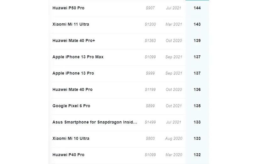 همانطور که مشاهده میکنید، رتبهی نخست در این لیست متعلق به هواوی P50 پرو است که متاسفانه بعد از تحریمهای آمریکا علیه هواوی، دیگر شاهد مقایسهی دوربین این گوشی با گوشیهای قدرتمند بازار نبودیم یا حداقل تعداد این بررسیها به حداقل رسید. در ردهی دوم نمایندهی شیائومی یعنی می 11 اولترا قرار گرفته که با اختلاف بسیار کمی نسبت به پرچمدار هواوی در رتبهی دوم قرار گرفته است. در رتبهی سوم باز هم نمایندهای از هواوی (P40 پرو پلاس) را شاهد هستیم و این یعنی سه رتبهی نخست متعلق به نمایندههای چینی است.