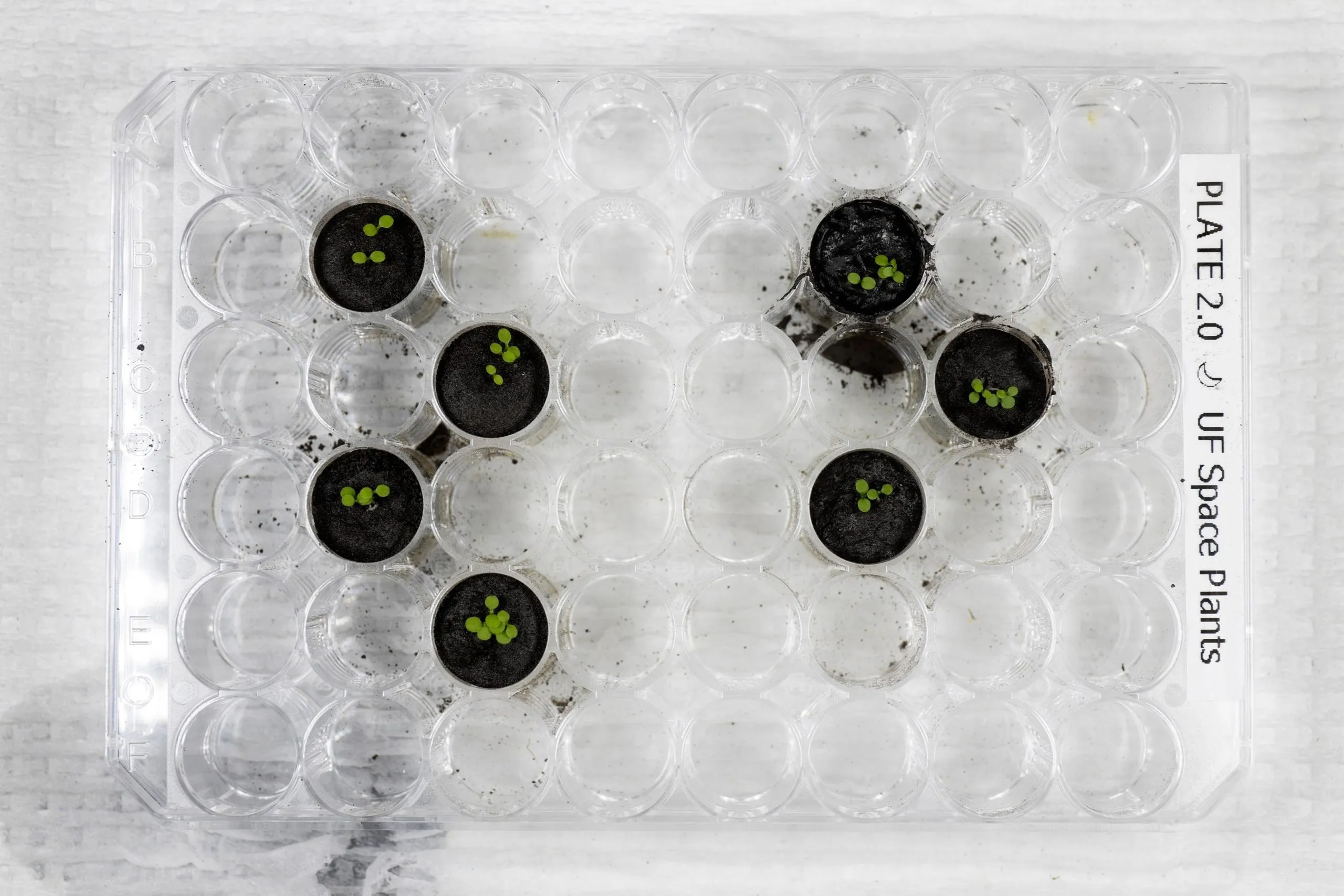 گیاهان آرابیدوپسیس 6 روز پس از کاشت بذرها. چهار لولهی آزمایش سمت چپ دارای گیاهانی هستند که در شبیهساز خاک ماه JSC-1A رشد میکنند. سه چاهک سمت راست دارای گیاهانی هستند که در خاک ماه رشد میکنند.