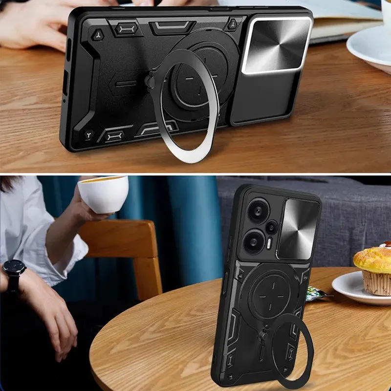 محصولات لوازم جانبی سامورایی همواره از کیفیت ساخت بسیار خوبی برخوردار بوده و اگر به دنبال خرید یک کاور محافظ شیک، جذاب و در عین حال مقاوم برای گوشی خود هستید، مدل Magic Ring شما را از خریدتان راضی نگه خواهد داشت. این کاور محافظ از جنس پلاستیک سخت و TPU تولید شده و مقاومت بسیار خوبی در برابر ضربات احتمالی و خطوخش از خود نشان میدهد. شما با اولین لمس این محصول متوجه دوام پایدار آن خواهید شد. از لحاظ وزنی، این لوازم جانبی برتر پوکو F5، حدود 50 گرم وزن دارد که شاید در اوایل استفاده از آن کمی وزن گوشی هوشمند شما را سنگین کند، اما پس از مدتی به آن عادت خواهید کرد و از این بابت مشکلی نخواهید داشت. درب کشویی سیستم دوربین، ویژگی مهم این کاور است که به طور همهجانبه از سنسورهای دوربین محافظت میکند.