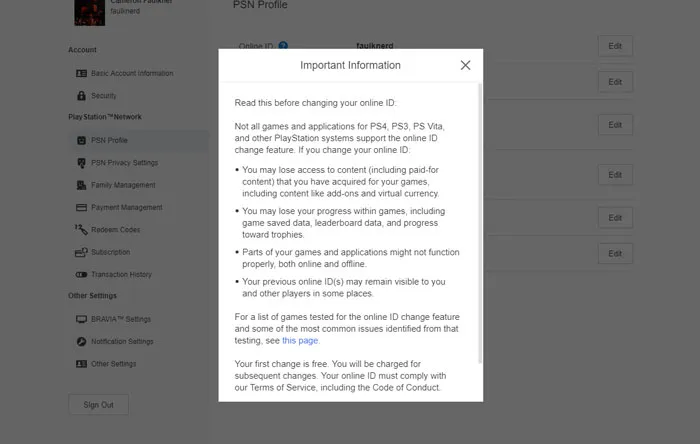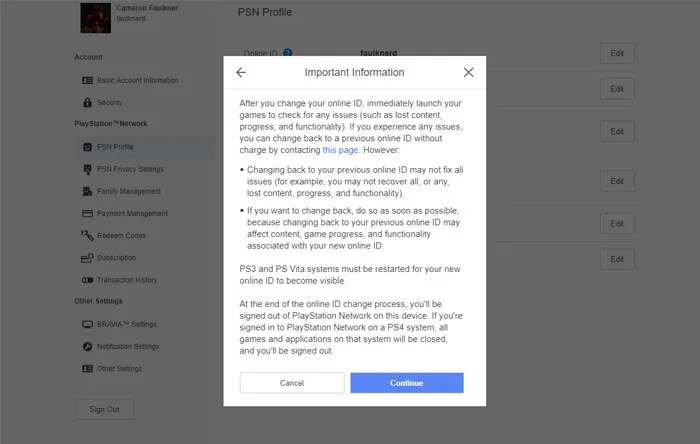 - در ادامه سونی هشدارهای بیشتری به شما میدهد. طبق توضیحات نوشته شده، اگر به مشکلی برخوردید میتوانید به عقب بازگردید و نام کاربری قبلی را پس بگیرید. با این حال، شاید مشکلات احتمالی باز هم حل نشوند. به صورت کلی، سونی میخواهد بگوید با تغییر نام کاربری خود احتمالا یک چیزی خراب شود یا از کار بیفتد. در هر صورت اگر حاضرید ریسک مشکلات را به جان بخرید، ادامه دهید و به صفحه بعدی بروید.
