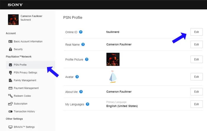 - اولین قدم این است که به سایت پلیاستیشن بروید و وارد اکانت خود شوید. بعد از این، میتوانید نام کاربری خود را ببینید. سایت سونی این قسمت را Online ID نامگذاری کرده است. سپس در کنار نام خود روی گزینه Edit کلیک کنید.