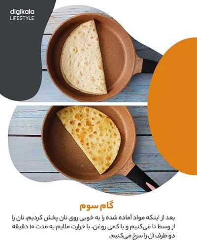 بعد از اینکه مواد آماده شده را بهخوبی روی نان پخش کردیم، نان را از وسط تا میکنیم و با کمی روغن، با حرارت ملایم به مدت 10 دقیقه دو طرف آن را سرخ میکنیم.