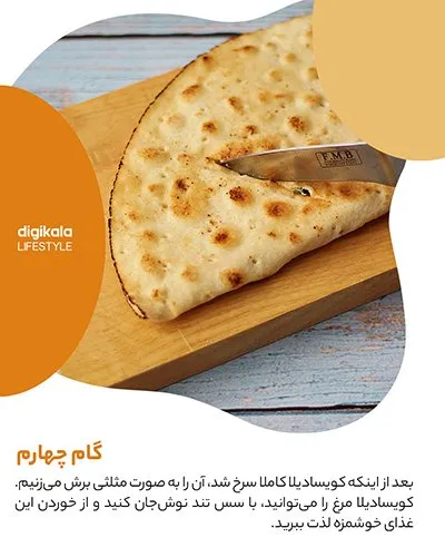 بعد از اینکه کویسادیلا کاملا سرخ شد، آن را به صورت مثلثی برش میزنیم. کویسادیلا مرغ را میتوانید با سس تند نوش جان کنید و از خوردن این غذای خوشمزه لذت ببرید.