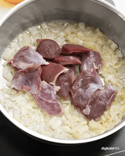 پیاز را به صورت نگینی ریز خرد کنید و با مقداری روغن در یک تابهی دیواره بلند تفت دهید تا طلایی و سبک شود. سپس گوشت را اضافه کنید و تفت دهید تا رنگ آن عوض کند.