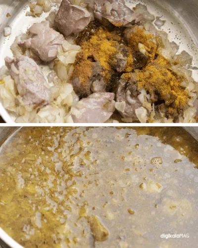 ادویهی گوشت، زردچوبه، فلفل سیاه، نیمی از دارچین را اضافه کنید و تفت دهید. کمی بعد آب جوش را تا جایی اضافه کنید که روی گوشت را بگیرد. سپس اجازه دهید با درب بسته به مدت تقریبا 2 ساعت بپزد.