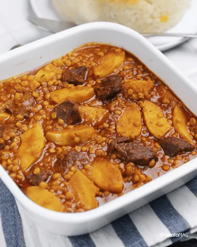 وقتی گوشت کاملا پخت، رب گوجهفرنگی تفت داده و لپهی پخته و آبکش شده را به آن اضافه کنید. در این مرحله با احتیاط به خورش آب جوش اضافه کنید تا به غلظت دلخواه برسید.