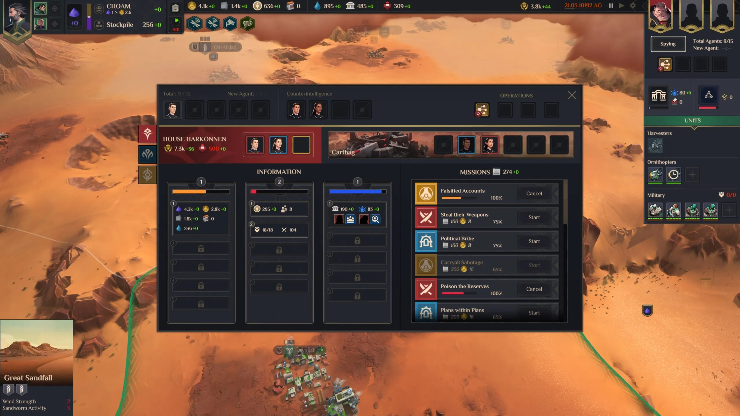 شما باید وجود کرمها را در نظر داشته باشید. پس منطقه خود را به گونهای بسازید که این موجودات غول پیکر نتوانند به آن حمله کنند. از طرفی میتوانید از این کرمها برای از بین بردن دشمنان استفاده کنید. همینطور اینکه روش کلاسیک مبارزه عادی نیز وجود دارد و شما میتوانید به دشمنان حمله کنید تا کنترل منابع ادویه را در دست بگیرید.