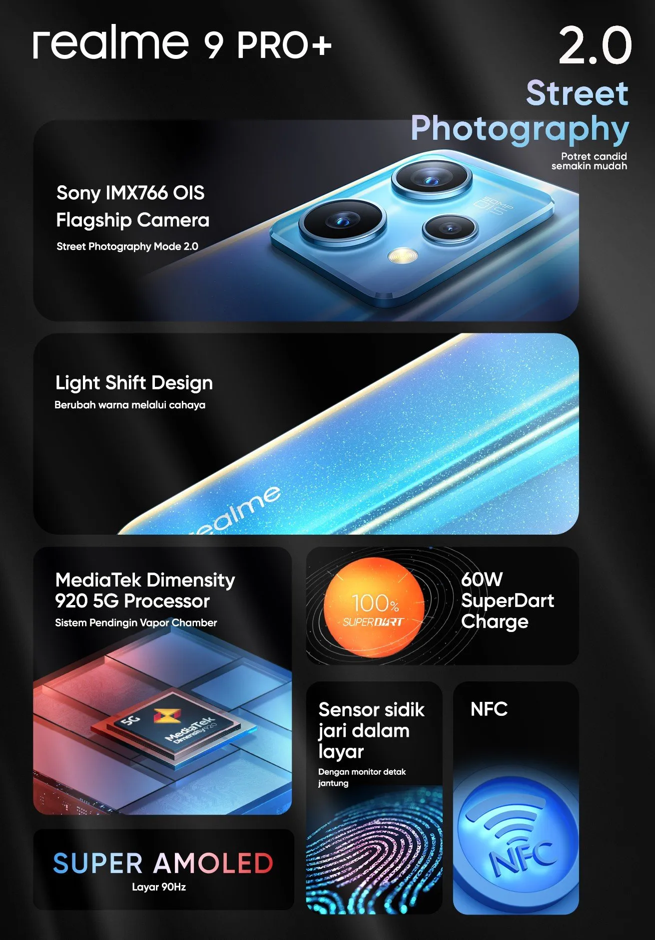 در این محصول دوربین اصلی 64 مگاپیکسلی خواهد بود و نباید انتظار داشته باشیم در حد و اندازههای پرچمدارها عکاسی یا فیلمبرداری کند. روی پنل جلو تفاوت بیشتری بین این مدل و مدل پرو پلاس شاهد هستیم. نمایشگری که ریلمی برای مدل 9 پرو در نظر گرفته از رفرشریت 120 هرتزی برخوردار است اما نوع پنل LCD است که این میتواند در مصرف انرژی تأثیر منفی بگذارد چرا که LCD از حالت تیرهی واقعی هم پشتیبانی نمیکند که کاربر بتواند از این طریق اندکی از مصرف باتری بکاهد. از جمله قابلیتهای مشترک دو محصول میتوان به پشتیبانی از NFC، اندروید 12 به عنوان سیستمعامل پیشفرض و همچنین رابط کاربری ریلمی UI 3.0 اشاره کرد.