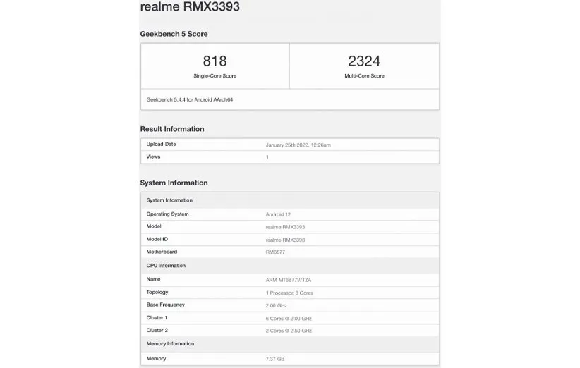 شماره مدل این گوشی با توجه به مشخصات گیکبنچ، RMX3393 است. طبق اطلاعات منتشر شده، این گوشی حداقل در مدلی که در گیکبنچ حضور پیدا کرد از 8 گیگابایت حافظهی رم بهره میبرد. حال آیا در مدل دیگری با حافظهی رم کمتر هم شاهد این محصول خواهیم بود یا خیر مشخص نیست. علاوه بر اینها، اندروید 12 به عنوان سیستمعامل پیشفرض این گوشی و قطعا مدلهای دیگر این سری ایفای نقش خواهد کرد.