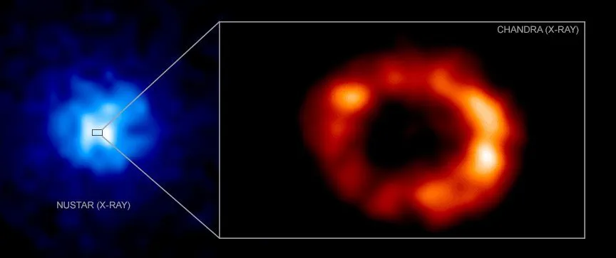 دادههای پرتو X تلسکوپ چاندرا از ابرنواختر SN 1987A در سمت چپ و طرحی گرافیکی از ستارهی نوترونی در مرکز یک ابرنواختر در سمت راست