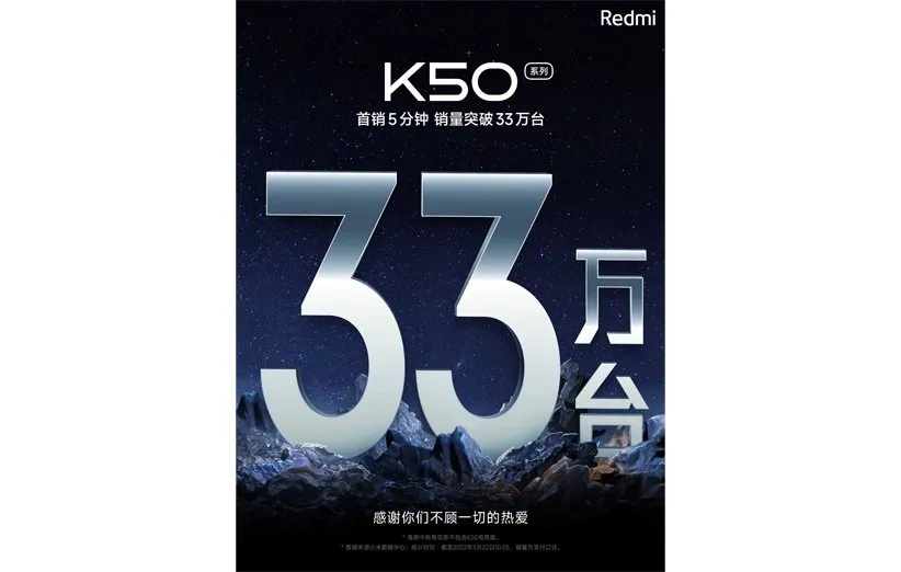 از ردمی K20 گرفته تا کنون همیشه گوشیهای سری ردمی KXX به خاطر قیمت بینظیر و مشخصات فنی عالی، فروش بسیار بالایی داشتهاند. ردمی K50 و K50 پرو هم به عنوان دو مدل از پرچمداران شرکت که بهتازگی نیز در دسترس قرار گرفتهاند برای اینکه به فروش بینظیر 330 هزار دستگاه دست پیدا کنند فقط 5 دقیقه زمان نیاز داشتند. این خبر رسمی است و از سوی حساب کاربری رسمی ردمی در ویبو به اشتراک گذاشته شده است. لازم به ذکر است گوشی گیمینگ از این سری هم در اولین دورهی فروش فوری خود (Flash Sale؛ در این دوره محصولات با تخفیف بسیار خوب در یک مدت محدود به فروش میرسند) توانست رکورد خوبی را به ثبت رساند چرا که 70 هزار دستگاه از آن در همان مدت محدود به فروش رفت.