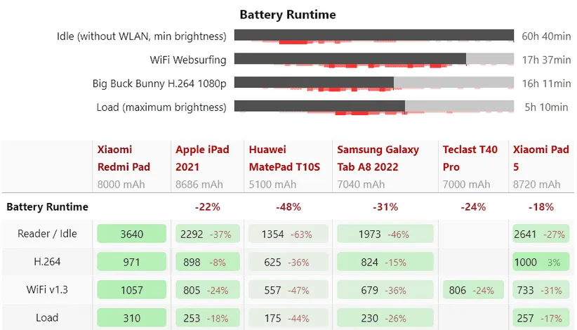 تبلت Redmi Pad به طرز حیرتآوری از جنبهی انرژی، کممصرف است. در حالیکه تبلتهای مشابه برای مثال، هوآوی MatePad T10S که اقتصادیتر از تبلت شیائومی هستند، از بابت انرژی پرمصرفتر محسوب میشوند.