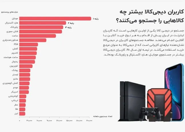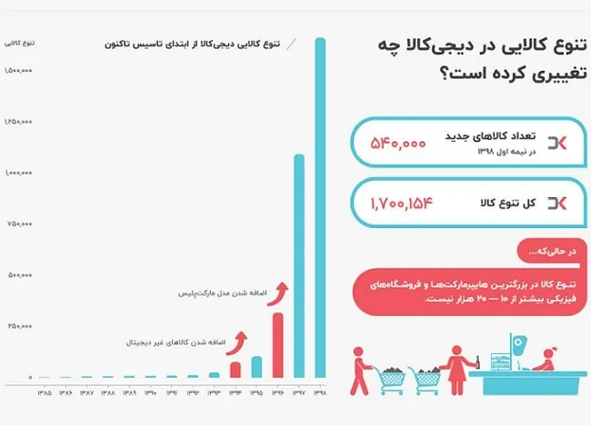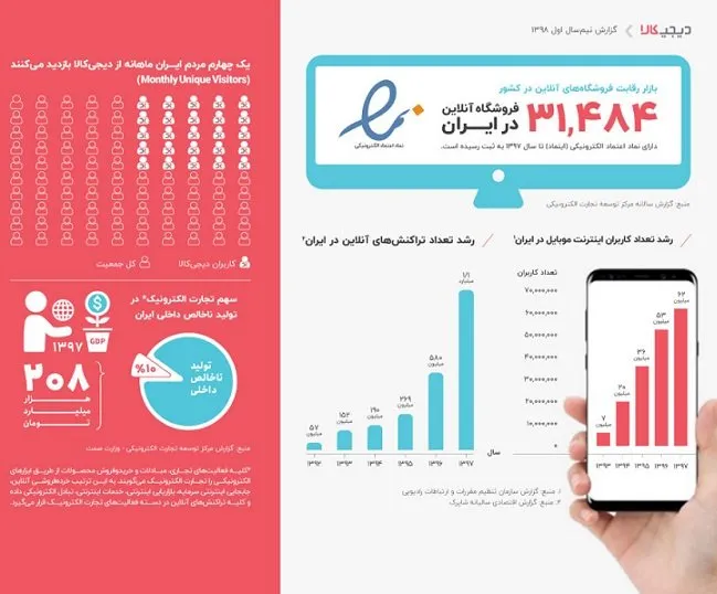 دیجی کالا با بیش از 20 میلیون بازدید کننده در ماه، یک چهارم مردم ایران را تحت پوشش قرار میدهد. بیش از 32 هزار فروشگاه آنلاین دارای نماید الکترونیکی، بازدید ماهانه یک چهارم مردم از دیجیکالا و افزایش تراکنشهای آنلاین، نشان میدهد که 10 درصد از سهم GPD ایران را سیستم دیجیتال شکل میدهد که همچنان هم در حال رشد است. به عبارت دیگر، نزدیک به 2 الی 3 درصد از فروش خورده فروشی در ایران مربوط به وب سایتهای آنلاین است که این مقدار همواره به سمت جلو در حرکت است.