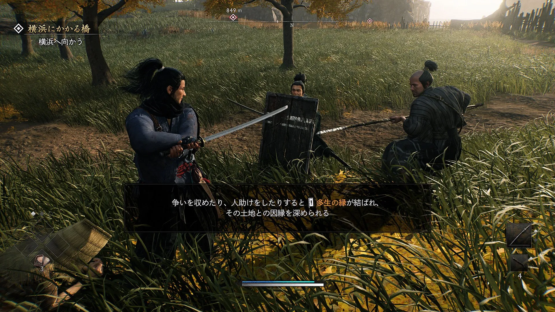اولین شهر بزرگی که قهرمان ضد شوگون داستان از آن بازدید میکند، یوکوهاما است. در منطقه کانای یوکوهاما، جایی که شرق به غرب میرسد، مکانهای دیدنی یوکوهاما مانند کنسولگری ایالات متحده، محلهی چینیها، مهمانخانهی ایالتی یوکوهاما، فانوس دریایی و غیره را کاوش خواهید کرد. همانطور که در حومهی یوکوهاما سفر میکنید، خود را در مجموعهای از مسافرخانهها در امتداد جادهی توکایدو، مهمترین مسیر عصر ذکر شده در ژاپن، مییابید که کیوتو، پایتخت امپراتوری، را به ادو، مقر توکوگاوا شوگونات، متصل میکند.