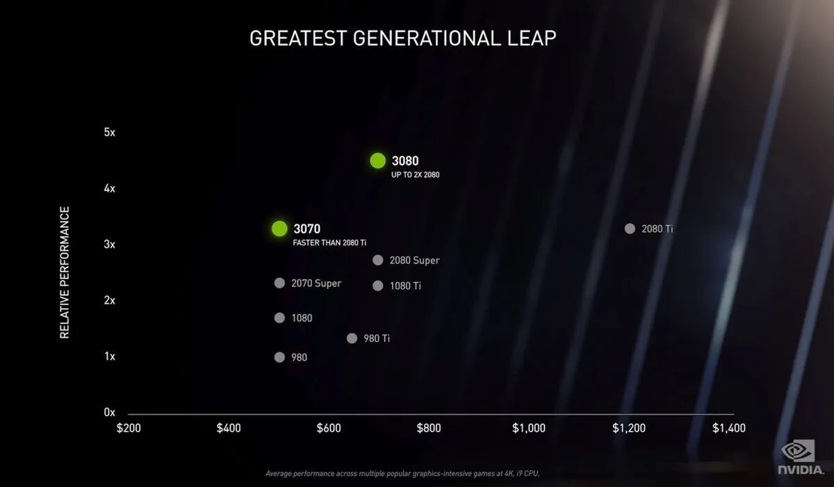 پرچمدار اصلی سری جدید کارت گرافیکهای انویدیا، RTX 3080 است. این کارت ۸۷۰۴ هستهی کودا و 144 هستهی RT دارد و با فرکانس مرکزی ۱۷۱۰ مگاهرتز فعالیت میکند. ظرفیت حافظهی GDDR6X این کارت ۱۰ گیگابایت است و باس۳۲۰ بیتی حافظهی این کارت سرعت ۱۹ گیگابیت بر ثانیهای فراهم میکند. عدد بزرگ این کارت که همه را شگفت زده کرده قدرت تئوری 29٫77 ترافلاپسی است. چنین قدرتی برای کارتی ۷۰۰ دلاری شگفتانگیز است.