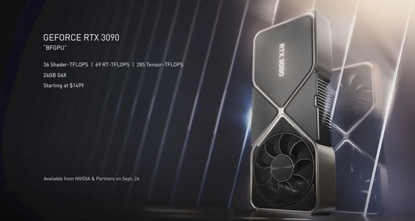 قدرتمندترین مدل سری جدید کارت گرافیکهای انویدیا RTX 3090 است که عظمتی بیهمتا دارد است. این کارت با فرکانس اصلی ۱۷۰۰ مگاهرتز، تعداد ۱۰۴۹۶ هستهی کودا و ۲۵۶ هستهی RT دارد. این کارت گرافیک، حجم عظیمی از ۲۴ گیگابایت حافظهی GDDR6X دارد که باس این حافظه ۳۸۹ و سرعت آن ۱۹٫۵ گیگابیت بر ثانیه است. کارت RTX 3090 که کلماتی مانند هیولا تا حدودی میتوانند قدرت آن را وصف کنند توان تئوری ۳۵٫۵۸ ترافلاپسی ارایه میدهد. چنین عددی به شکل بیسابقه بالاست.