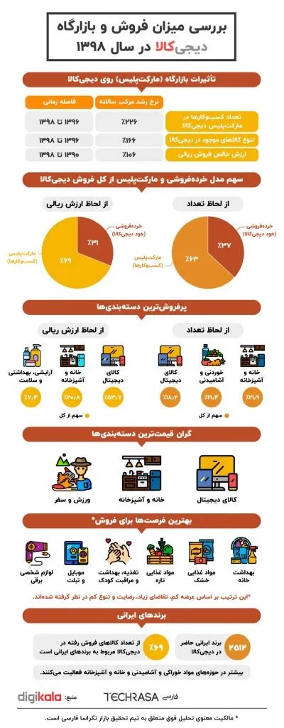 پرفروشترین دستهبندیهای کالا در سال ۱۳۹۸ از لحاظ تعداد، خانه و آشپزخانه و خوردنی و آشامیدنی و از لحاظ ارزش ریالی فروش، کالای دیجیتال و خانه و آشپزخانه هستند.