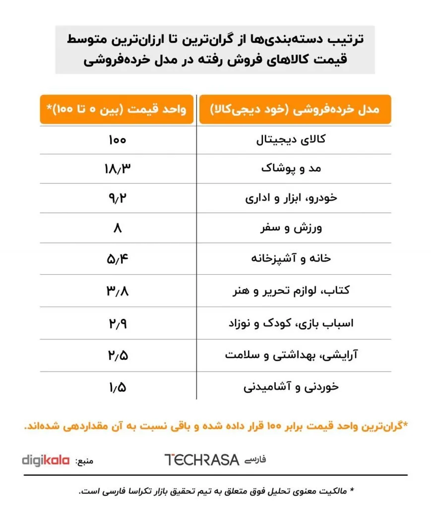اختلاف بالای واحد قیمت در دسته کالای دیجیتال با سایر دستهبندیها، نشاندهنده این است که عمده کالاهای فروش رفته در این دسته، کالاهایی گرانقیمت مانند لپتاپ، دوربین و موبایل هستند.