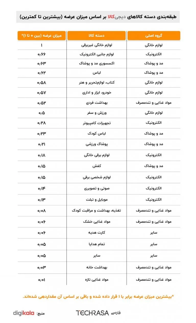 طبق جدول فوق، سه دسته کالای بهداشت فردی، مواد غذایی خشک و لوازم جانبی الکترونیک بیشترین تقاضا را در دیجیکالا دارند. دو دسته اول مربوط به مواد غذایی و تندمصرف (FMCG) و مورد آخر زیرمجموعه الکترونیک است.