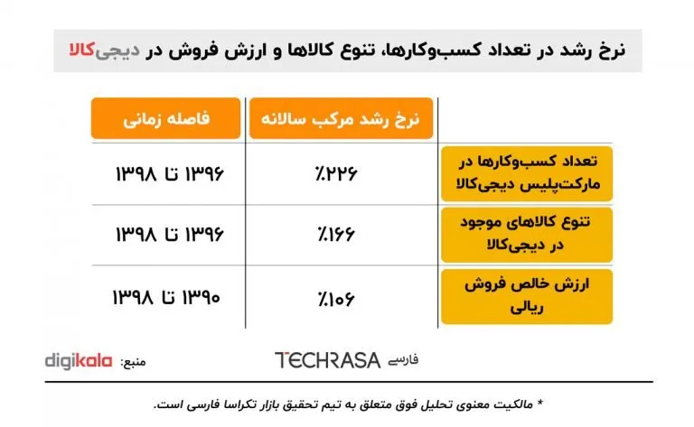 اگر نرخ مرکب رشد سالانه تعداد کسبوکارها در مارکتپلیس و تنوع کالاهای موجود در دیجیکالا را با هم مقایسه کنیم، متوجه میشویم که افزایش تعداد کسبوکارها به خوبی توانسته تنوع کالاها را افزایش دهد. به جدول زیر توجه کنید