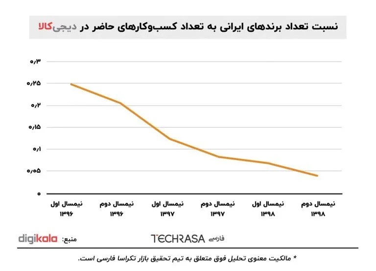 همان طور که مشاهده میشود درصد برندهای ایرانی در کسبوکارهای فعال در مارکتپلیس دیجیکالا اندک بوده و روند نزولی داشته است. علل این موضوع میتواند شامل موارد زیر باشد: