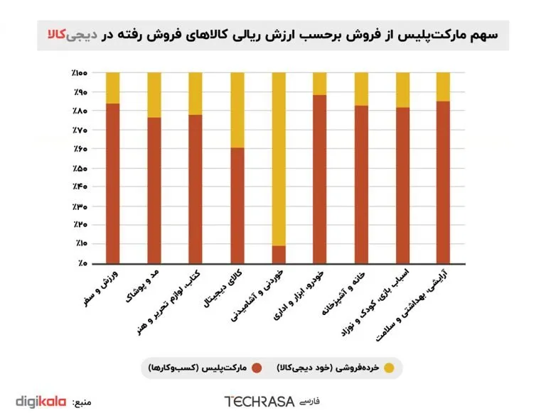 در دستهبندیهای مد و پوشاک و کالای دیجیتال، دیجیکالا از نظر تعداد کالاهای فروش رفته، سهم کمتر و از نظر ارزش ریالی فروش، سهم بیشتری دارد. این موضوع بیشتر در دسته کالای دیجیتال قابل مشاهده است؛ زیرا این دستهبندی پرفروشترین دسته از لحاظ ارزش ریالی است. بنابراین کالاهای دیجیتالی که توسط خود دیجیکالا به فروش میرسند، عمدتاً قیمت بالاتری دارند (مانند لپتاپ، دوربین عکاسی و گوشیهای هوشمند) و کالاهای دیجیتالی که عمدتاً قیمت پایینتری دارند (مانند پاوربانک و لوازم جانبی) توسط سایر کسبوکارها فروخته میشوند.