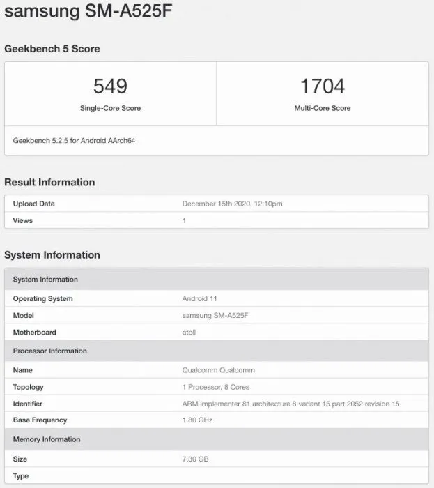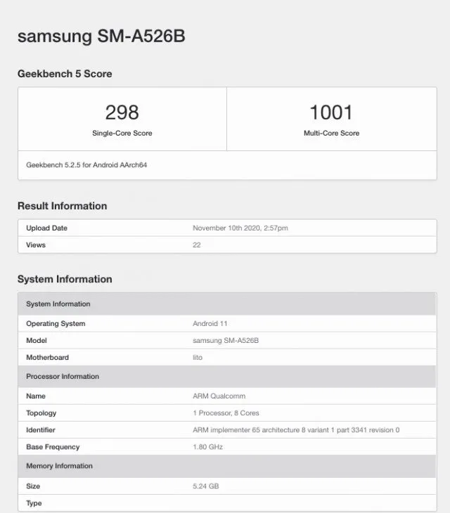 در بنچمارکی که اخیرا منتشر شده، گلکسی A52 4G را با 8 گیگابایت حافظهی رم شاهد هستیم که توانسته امتیاز بیشتری چه در بخش تک هستهای و چه در بخش چند هستهای از مدل 5G خود با 6 گیگابایت حافظهی رم کسب کند. البته بدیهی است امتیاز بهدست آمده برای مدل نهایی محصول نیست و چیزهای اینچنینی کاملا طبیعی است. با این حال این بنچمارک اطلاعات خوبی از مشخصات فنی این محصول در اختیارمان قرار داد.