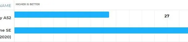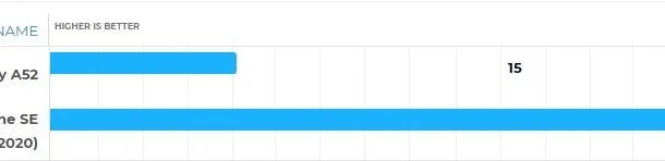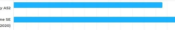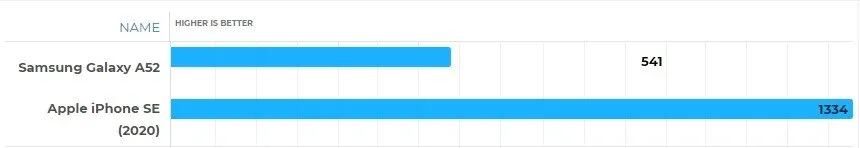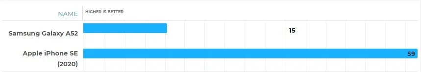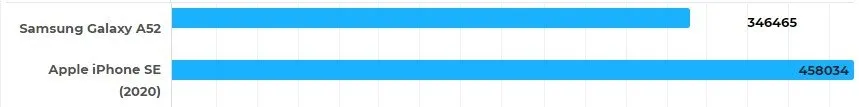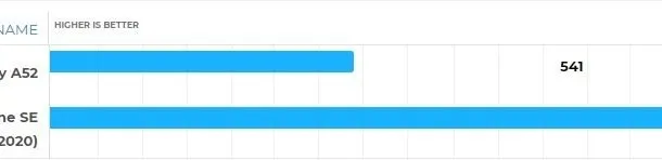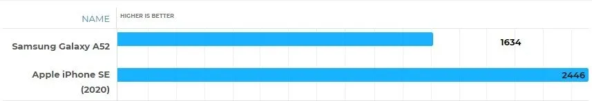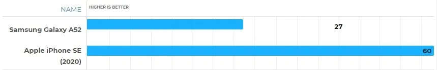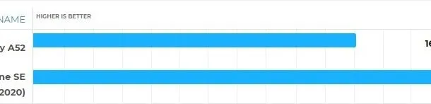 گلکسی A52 در مدل پایهی خود به 128 گیگابایت حافظهی داخلی مجهز شده که پشتیبانی از کارت حافظهی جانبی هم باعث شده کاربر هیچ نگرانی از بابت اتمام حافظه نداشته باشد. از طرفی آیفون SE 2020 در مدل پایهی خود که حدود 400 دلار هم قیمت دارد، به 64 گیگابایت حافظهی داخلی مجهز شده و از کارت حافظهی جانبی هم پشتیبانی نمیکند. کاربر برای خرید مدل 128 گیگابایتی این محصول هم باید حدودا 50 دلار بیشتر بپردازد. شما عزیزان میتوانید عملکرد سختافزاری دو گوشی را در بنچمارکهای مختلف در زیر مشاهده کنید.