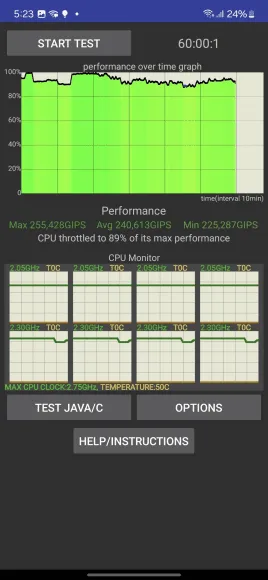 گلکسی A55 نیز در تستهای استرس عملکرد خوبی نشان داده و تقریباً در حداکثر عملکرد باقی ماند. اگرچه از لحاظ پایداری این گوشی خیلی بهتر از پوکو F6 بود اما چون قدرت و سرعت آن ذاتاً کمتر از پوکو است، باز هم نمیتواند به خوبی این گوشی در انجام کارهای سنگین ظاهر شود.