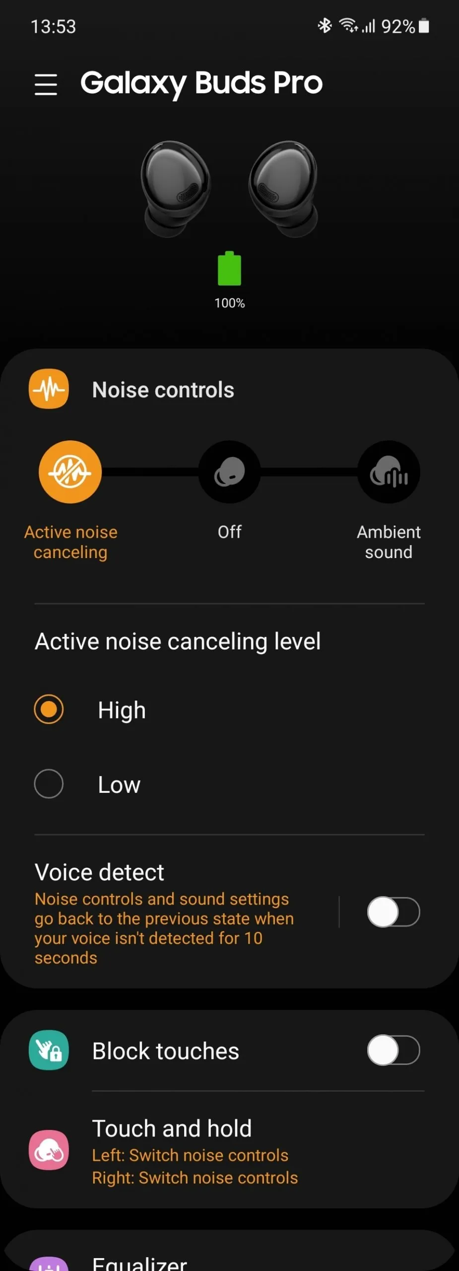 اگر از گوشیهای دیگر استفاده میکنید، توصیه میشود حتما اپلیکیشن Galaxy Wearable را دانلود کنید تا بتوانید هدفون بیسیم خود را از جنبههای مختلف شخصیسازی کنید. در واقع بدون این اپلیکیشن، گلکسی بادز پرو یک هدفون بیسیم معمولی خواهد بود چرا که به کمک این برنامه میتوانید به تنظیمات اکولایزر دسترسی داشته باشید، شدت حذف نویز و حالت محیطی را تغییر دهید و حتی کنترلهای لمسی را مطابق سلیقهی خود تنظیم کنید.