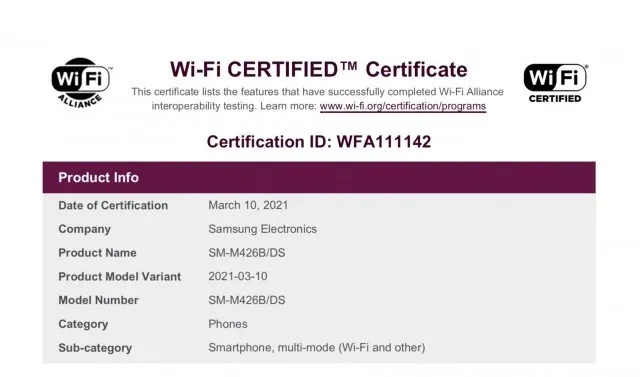 در ماه نوامبر سال گذشته، گلکسی M42 در لیست گواهی متعددی دیده شد که با توجه به آنها، فهمیدیم این محصول از یک باتری 6000 میلیآمپر ساعتی بهره میبرد. حال همین گوشی با شماره مدل SM-M426B/DS گواهی وایفای را هم دریافت کرده. آنچه که باعث شده حدس بزنیم این گوشی مجهز به اینترنت 5G است، سه حرف آخر شماره مدل آن یعنی B/DS است که تاکنون در تمام گوشیهای مجهز به 5G سامسونگ که در بازار بینالمللی به فروش میرسند شاهد آن بودیم. این یعنی گلکسی M42 هم احتمالا مجهز به اینترنت 5G و از این نظر، اولین گوشی در بین میانردههای سری M خواهد بود.