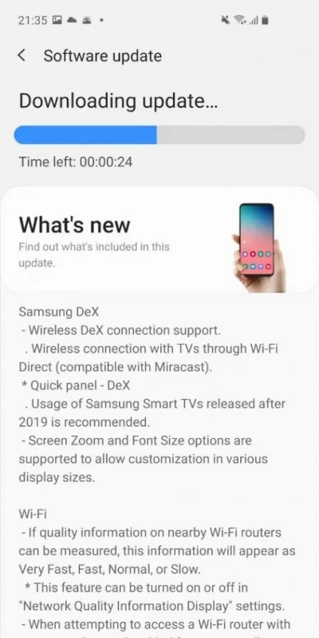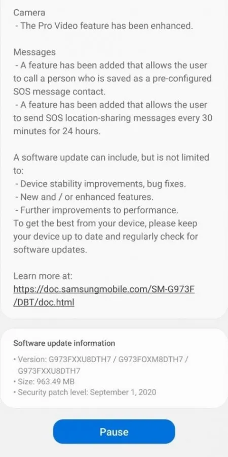 این بهروزرسانی G973FXXU8DTH7/G973FOXM8DTH7/G973FXXU8DTH7 نام داشته و 963 مگابایت حجم دارد. البته باید به این نکته هم اشاره کنیم که اعداد بولد شده (3)، برای مدلهای مختلف اس 10، متفاوت است. این بهروزرسانی قابلیتهای زیادی را برای گوشیهای پرچمدار سامسونگ به همراه خواهد داشت که از جمله مهمترین آن میتوان به سامسونگ دکس بیسیم اشاره کرد.