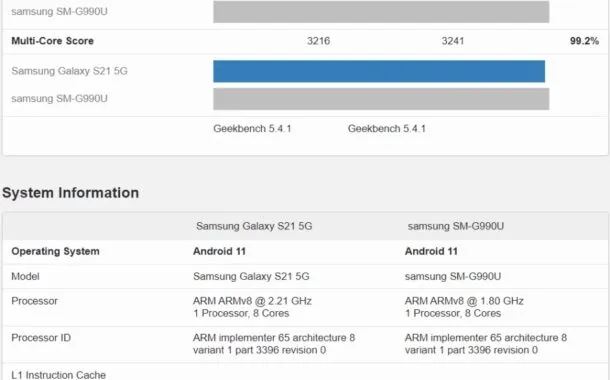 پیش از این شاهد حضور محصولی با 8 گیگابایت حافظهی رم و شماره مدل SM-G990B در گیکبنچ بودیم. به نظر میرسد این شماره مدل واقعا برای S21 فن ادیشن باشد چرا که سامسونگ برای S20 فن ادیشن شماره مدل SM-G780، برای گلکسی S20 شماره مدل SM-G980 و برای گلکسی S21 هم SM-G991 را در نظر گرفت. بنابراین SM-G990B بالاتر از S20 و پایینتر از S21 قرار میگیرد، یعنی دقیقا همان چیزی که انتظار داشتیم باشد.