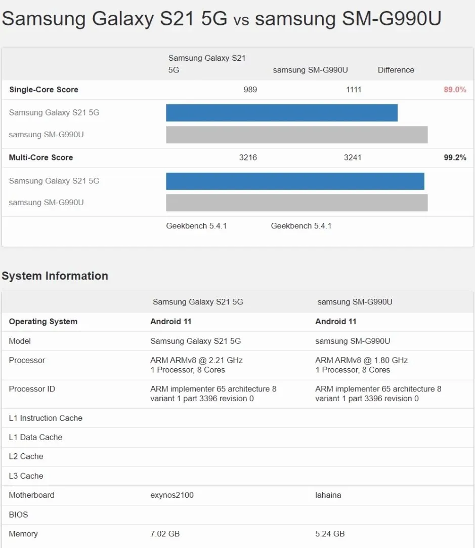 پیش از این شاهد حضور محصولی با 8 گیگابایت حافظهی رم و شماره مدل SM-G990B در گیکبنچ بودیم. به نظر میرسد این شماره مدل واقعا برای S21 فن ادیشن باشد چرا که سامسونگ برای S20 فن ادیشن شماره مدل SM-G780، برای گلکسی S20 شماره مدل SM-G980 و برای گلکسی S21 هم SM-G991 را در نظر گرفت. بنابراین SM-G990B بالاتر از S20 و پایینتر از S21 قرار میگیرد، یعنی دقیقا همان چیزی که انتظار داشتیم باشد.