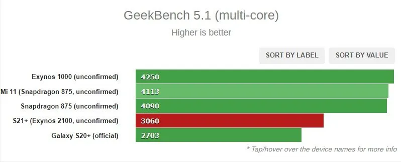 گزارشهایی که تاکنون پیرامون پرچمدارهای سال آیندهی سامسونگ منتشر شده روی این موضوع اتفاق نظر داشتند که این محصولات از پردازندهی اگزینوس 1000 بهره میبرند. همچنین شنیده بودیم این پردازنده بالاخره توانست سنتشکنی کند و رقیب قدرتمند خود یعنی اسنپدراگون 875 را که اتفاقا با فناوری 5 نانومتری سامسونگ هم تولید میشود، پشت سر بگذارد. این گفتهها بر اساس نتیجهی بنچمارک گیکبنچ دو مدل از گلکسی اس 21 پلاس بود که یکی از کاربران ردیت آن را با کاربران به اشتراک گذاشت.